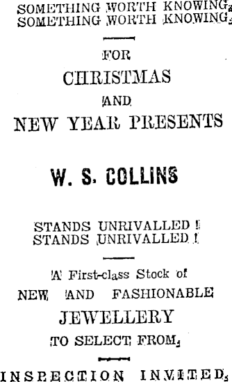 SOMETHING WORTH KNOWING* SOMETHING .WORTH KNOWING-, FOR CHRISTMAS [AND NEW YEAH PRESENTS W. S. COLLINS STANDS UNRIVALLED !i STANDS .UNRIVALLED I. A First-class Stock of NEW 'AND FASHIONABLE JEWELLERY TO SELECT FROMj INSEECTION INVITED.