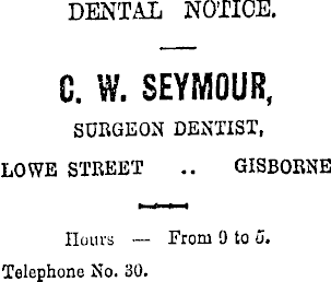 DENTAL NOTICE. C. W. SEYMOUR, SURGEON DENTIST, LOWE STREET .. GISBORNE, Hours From 9to o. Telephone No. 30.