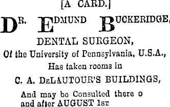 [A CARD.] D B DENTAL SURGEON, 0 1 the University of Pennsylvania, U.S.A., Has taken rooms in C. A. DeLAUTOUR’S BUILDINGS, And may bo Consulted there o and after AUGUST lsi E DMUND B UCKERIDGE,