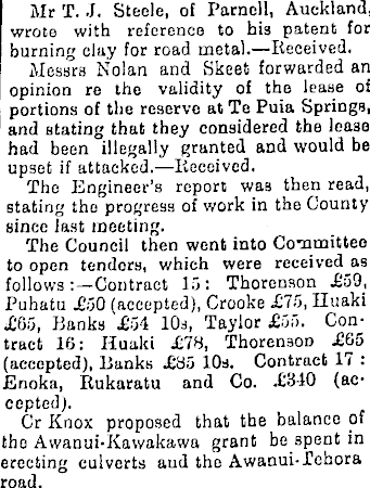 Mr T. .1. Steele, of Parnell, Auckland, wrote with reference to his patent for burning clay for road metal.—Received. Messrs Nolan and Skeet forwarded an opinion re the validity of the lease of portions of the reserve at Te Puia Springs, and stating that they considered the lease had been illegally granted and would be upset if attacked. —Received. The Engineer’s report was then read, stating the progress of work in the County since last meeting. The Council then went into Committee to open tenders, which were received os follows :—Contract 15 : Thorenson .£59, Puhatu £SO (accepted), Crooke £75, Iluaki £65, Banks £54 10s, Taylor £55. Contract 16: Huaki £7B, Thoren3oD £65 (accepted), Ranks £BS 10s. Contract If : Enoka, Rukaratu and Co. £340 (accepted). Cr Knox proposed that the balance of tho Awanui-Kawakawa grant be spent in erecting culverts aud the Awanui-Tohora road.