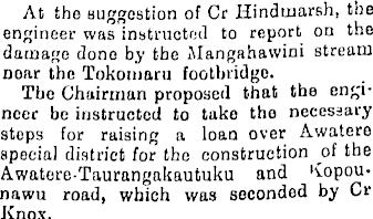 At the suggestion of Cr Hindmarsh, the engineer was instructed to report on the damage done by the Mangahawini stream near the Tokotiiaru footbridge. The Chairman proposed that the engineer be instructed to take the necessary steps for raising a loan over Awatere special district for the construction of the Awatore-Taurangakautuku and 'vopounawu road, which was seconded by Cr Knox.