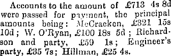 Accounts to the amount of .£713 4s 8d wero passed for payment, the principal amounts being: McCracken, .£321 15s lOd ; \V. O’Ryan, £IOO 18s scl ; Richardson and party, £59 Is; Engineer’s party, £35 7s; Hillman, £25 4s.