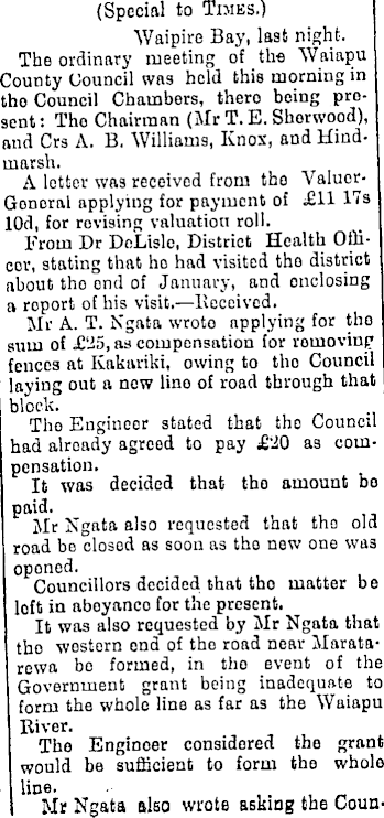 (Special to Times.) Waipire Bay, last night. The ordinary meeting of the Waiapu i County Council was held this morning in the Council Chambers, thero being present: The Chairman (Mr T. E. Shorwopd), and Crs A. B. Williams, Knox, and Mindmarsh. A letter was received from the ValuerGonoral applying for payment of £ll lfs lOd, for revising valuation roll. From Dr DeLisle, District Health Officor, stating that ho had visited tho district about tho ond of January, and enclosing a report of his visit. —Deceived. Mr A. T. Ngata wroto applying for the sum of £25, as compensation for removing fences at Kaknriki, owing to tho Council laying out a now lino of road through that block. Tho Engineor stated that the Council had alroady agreed to pay £2O as compensation. It was decided that tho amount bo paid. Mr Ngata also requested that tho old road be closed as soon as tho new one was opened. Councillors decided that tho matter be loft in abeyanco for the present. 1 It was also requested by Mr Ngata that tho western end of the road near Maratarewa be formed, in tho event of the Government grant being inadequate to form the whole line as far as tho Waiapu , River. . Tho Engineer considered the grant 1 would be sufficient to form the whole 1 line. , , „ Mr Ngata also wrote asking the Coun-