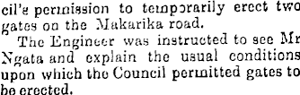 cil’e permission to temporarily erect two gates oo the Makarika road. The Engineer was instructed to see Mr Ngata and explain the usual conditions upon which the Council permitted gates to bo erected.