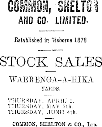 Jiviiuunj AND CO- LISV3ITED. Established in Gisborne 1878 STOCK SALES WAEB ENGA-A-HIKA YARDS. THURSDAY, APRIL' J. THURSDAY, MAY 7th. THURSDAY, .JU.MIO .Ith. COMMON, SEELTON & CO„ Ltd.