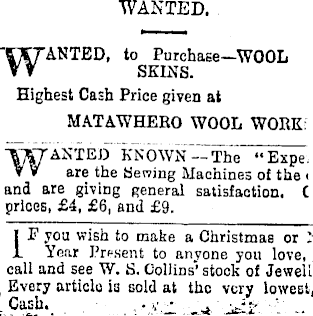 WANTED. WANTED, to Purchase—WOOL ?T SKINS. Highest Cash Price given at MATAWHERO WOOL WORK WANTED KNOWN—The “Expe are the Sewing Machines o£ the ( and are giving general satisfaction. C prices, £4, £6, and £9. j F you wish to make a Christmas or 1 1 Year Present to anyone you love, call and see W. S. Collins’ stock of Jewell' Every article is sold at the very lowest. Cash.. • _L _ 4 :