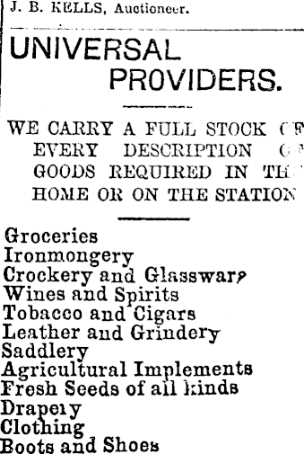 J. B. KELLS, Auctioneer. UNIVERSAL PROVIDERS. WE CARRY A FULL STOCK ( F EVERY DESCRIPTION ( ’ GOODS REQUIRED IN TK HOME OR ON THE STATION J Groceries Ironmongery Crockery and Glassware Wines and Spirits Tobacco and Cigars Leather and Grindery Saddlery Agricultural Implements Fresh Seeds of ail kinds Drapeiy Clothing Boots and Shoes