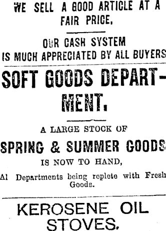 WE SELL A GOOD ARTICLE AT A FAIR PRICE. OUR CASH SYSTEM IS MUCH APPRECIATED BY ALL BUYERS SOFT GOODS DEPARfA LABGE STOCK OF SPRING & SUMER GOODE IS NOW TO HAND, A 1 Departments being replete with Fresh Goods. KEROSENE OIL STOVES.
