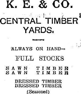 K. E. & CO. CENTRAL TIMBER YARDS. 'ALWAYS ON HAND—PULL STOCKS SAWN TIMBER SAWN TIMBER DRESSED TIMBER DRESSED TIMBER (Seasoned)