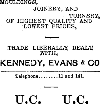 MOULDINGS, JOINERY;, AND TURNERY, OP HIGHEST QUALITY AND LOWEST PRICES, TRADE LIBERALLYi DEALT, .WITH, KENNEDY. EVANS & CO Telephone II and 141. u.c. u.c