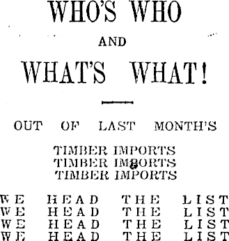 WHO’S WHO AND WHAT’S WHAT! OUT OF LAST MONTH’S TIMBER IMPORTS TIMBER LMgORTS TIMBER IMPORTS II E A D T H E LIST HEAD T II E LIS T HEAD THE LIST HEAD THE LIST