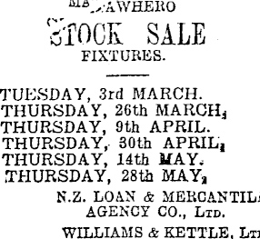 ua ;":AWHEHO Stock sale FIXTURES. TUESDAY, 3rd MARCH. THURSDAY, 26th MARCH* THURSDAY, 9th APRIL. THURSDAY, 30th APRIL, THURSDAY, 14th MAY, .THURSDAY, 28th MAY, N.Z. LOAN & MEKCANTIL. AGENCY CO., Lid. WILLIAMS & KETTLE, Ltj