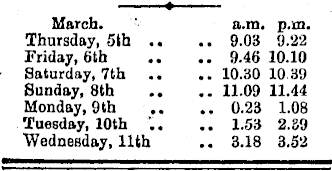 March. a.ra. p.m. Thursday, 5th .. .. 9.03 9.22 Friday, 6th .. 9.46 10.10 Saturday, 7th .. 10.30 10.39 Sunday, 8th .. 11.09 11.44 Monday, 9 th .. 0.23 1.08 Tuesday, 10th .. 1.53 2.39 Wednesday, 11th .. 3.18 3.52