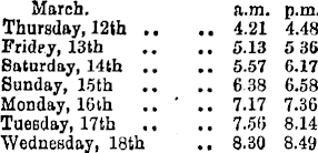 March. a.m. p.m. Thursday, 12th .. .. 4.21 4.48 Fridey, 13th .. 5.13 5 36 Saturday, 14th .. .. 5.57 6.17 Sunday, 15th .. 6 38 6.58 Monday, ICth .. 7.17 7.36 Tuesday, 17th .. 7.56 8.14 Wednesday, 18th .. 8.30 8.49