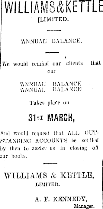 AfILLIAMS&KETTLE [LIMITED. ANNUAL BALANCE. We would remind our clienlb ilia! our ANNUAL BALANCE ANNUAL BALANCE Takes place on 31st MARCH, And would request thal ALL OUT.STANDINC ACCOUNTS be settled by then to assist- us in closing of! our books. WILLIAMS & KETTLE, LIMITED. A. F. KENNEDY, Manager.