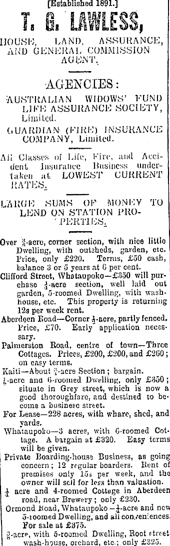 [Established 1891.] T, B.'LAWLESS, 110 UK 10, LAND, ASSURANCE, AND GENERAL COMMISSION AGENT, •AGENCIES: •AUSTRALIAN WIDOWS’ FUND LIFE ASSURANCE SOCIETY, Limited. GUARDIAN' (FIRE) INSURANCE COMPANY, Limited. Ail Classes of Life, Fire, and Accident Insurance Business undertaken at LOWEST CURRENT RATES. LARGE SUMS OF MONEY TO LEND ON STATION PRO- ' PERTIES. Over ;4-acre, corner section, with nice little Dwelling, with outsheds, garden, etc. Price, only £220. Terras, £SO cash, balance 3 or 5 years at C per cent. Clifford Street, Whataupoko—£3so will purchase .-[-acre section, well laid out garden, 5-roomed Dwelling, with washhouse, etc. This property is returning 12s per week rent. Aberdeen Road —Corner 1-acre, partly fenced. Price, £7O. Early application necessary. Palmerston Eoad, centre of town—Three Cottages. Prices, £2OO, £2OO, and £200; on easy terms. Kaiti —About : ';-acre Section ; bargain. 1,-acre ana 0-roomed Dwelling, only £850; situate in Grey street, which is now a good thoroughfare, and destined to become a busineec street. For Lease—22B acres, with wbarc, shed, and yards. Whataupoko—3 acres, with G-roomed Cottage. A bargain at £B2O. Easy terms will be given. Private Boarding-house Business, aB going concern; 12 regular boarders. Kent of premises only 15s per week, and the owner will sell for less than valuation. \ acre and 4-roomed Cottage in Aberdeen road, near Brewery ; only £230. Ormond Eoad, Whataupoko - J-acre and new 5-roomed Dwelling, and alt conveniences. For sale at £375. g-aerp, with 5-roomed Dwelling, Boot Ftrcet, wash-house, orchard, etc.; only £325.
