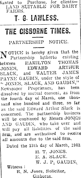iVanted to Purchase, for clients — LAND SUITABLE FOR DAIRY FARMS. T. 0. LAWLESS. THE GISBORNE THVIES. PARTNERSHIP NOTICE. NOTICE is hereby given that- the Partnership hitherto existing between HAMILTON THOMAS JONES, EDWARD ARTHUR SLACK, and WALTER JAMES PAYNE GAUDIN, under the style ol “ JONES, SLACK, AND GAUDIN,” Newspaper Proprietors, has been dissolved by mutual consent, as from the fourth day of March, one thousand nine hundred and three, so far as the said Edward Arthur Slack is concerned. The partnership business will be continued by Messrs JONES AND GAUDIN, who take over and will pay all liabilities of the said firm, and are authorised to receive all amounts due to the said firm. Dated the 13th day of March, 1303, H. T. JONES. E. A. SLACK. W. J. P. GAUDIN, Witness : R. N. Jones, Solicitor, Gisborne.