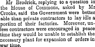 Mr Brodrick, replying to a question in the House of Commons, asked by Mr Crooks, said the Government were better able than private contractors to lay idle a portion of their factories. Moreover, unless contractors were encouraged in peace time they would be unable to establish the necessary plant for expansion of orders in war time.