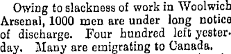 Owing to slackness of work in Woolwich Arsenal, 1000 men are under long notice of discharge. Four hundred left yesterday. Many are emigrating to Canada.