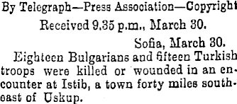 By Telegraph—Press Association—Copyright Beeeived9.3s p.m., March 30. Sofia, March 30. Eighteen Bulgarians and fifteen Turkish troops were killed or wounded in an encounter at Istib, a town forty miles southeast of Dskup.