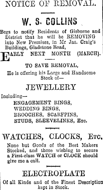 NOTICE OE REMOVAL. W. s. COLLINS Begs to notify Residents of Gisborne and District that he will be REMOVING into New Premises, in Mr Jas. Craig’s Buildings, Gladstone Road, -pURLY NEXT MONTH (MARCH). TO SAVE REMOVAL, He is offering his Large and Handsome Stock of— JEWELLERY Including— ENGAGEMENT RINGS, WEDDING RINGS, BROOCHES, SCARFPINS, STUDS, SLEEVELINKS, Etc. WATCHES, CLOCKS, Etc. None but Goods of the Best Makers Stocked, and those wishing to secure a First-class WATCH or CLOCK should give me a call. ELECTROPLATE Of all Kinds and of the Finest Description kept in Stock.