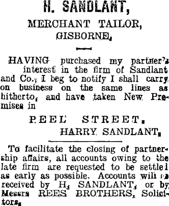 h. mnim, MERCHANT TAILOR, GISBORNE* HAVING purchased my partners interest in the firm of Sandlant and C 0.7 I beg to notify I shall carry, on business on the same lines as hitherto, and have taken New Premises in PEEL' STREET, HARRY SANDLANT, To facilitate the closing of partnership affairs, all accounts owing to the late firm are requested to be settle 1 as early as possible. Accounts will i-j received by H* SANDLANT, or by Messrs REES BROTHERS, Solicitors,