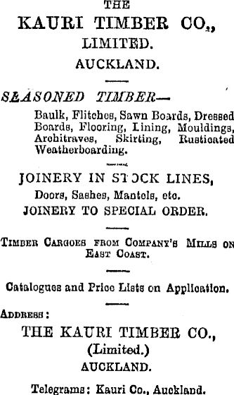 THE KAURI TIMBER GO., LIMITED. AUCKLAND. SEASONED TIMBER— Baulk, Flitches, Sawn Boards, Dressed Boards, Flooring, lining, Mouldings, Arohitraves, Skirting, Rustioated Weatherhoarding. JOINERY IN STOCK LINES, Doors, Sashes, Mantels, eta. JOINERY TO SPECIAL ORDER. Timbeb Cabqoes fbom Comeaux’s Mills on East Coast. Catalogues and Prioe Lists on Application, Addbess : THE KAIJRI TIMBER CO., (Limited.) AUCKLAND. Telegrams: Kauri Co., Auckland.