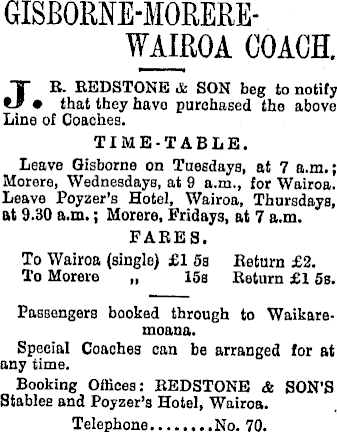 GISBORNE-MORERE-WAIROA OOAOH. JR. REDSTONE & SON beg to notify • that they have purchased the above Line of Coaches. TIME-TABLE. Leave Gisborne on Tuesdays, at 7 a.m.; Morere, Wednesdays, at 9 a.m., for Wairoa. Leave Poyzer’s Hotel, Wairoa, Thursdays, at 9.30 a.m.; Morere, Fridays, at 7 a.m. FARES. To Wairoa (single) £1 5s Return £2. To Morere „ Iss Return £1 sb. Passengers booked through to Waikaremoana. Special Coaches can be arranged for at any time. Booking Offices: REDSTONE & SON’S Stables and Poyzer’s Hotel, Wairoa. Telephone No. 70.