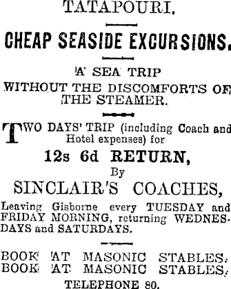 TATAPOUBI. CHEAP SEASIDEJXOURSmS, 'A’ SEA TRIP WITHOUT THE DISCOMFORTS OR THE STEAMER. rpWO DAYS’ TRIP (including Coach and Hotel expenses) for 12s 6d RETURN, By SINCLAIR’S COACHES, Leaving Gisborne every TUESDAY and FRIDAY MORNING, returning WEDNESDAYS and SATURDAYS. BOOR AT MASONIC STABLES.BOOK AT MASONIC STABLES,TELEPHONE 80.