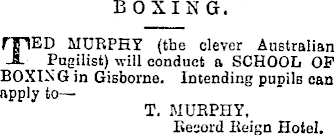 BOXING. TED MURPHY (the clever Australian Pugilist) will conduct a SCHOOL OP BOXIN Gin Gisborne. Intending pupils can apply to— T. MURPHY, Record Reign Hotel.