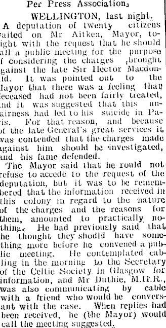 Per Press Association;, WELLINGTON, last night. A deputation of twenty citizens .ailed on Mr Aitkea, Mayor, toight with the request that lie should ;all a public meeting for tiic purpose if considering the charges .brought (gains I the late Sir llector MacdiruiTd. ll was pointed out to the tlayor that there was a feeling that' leeeased had not. been fairly treated, aid it was suggested that this unairness had led to his suicide in Pans. For that reason, and because lil the late General’s great services it was contended that the charges made against him should he ‘investigated, and his fame defended. The Mayor said that he rould not refuse to accede to the request of the deputation, but it was to lie remembered that the information received in this colony in regard to the 'nature of the charges and the reasons for them, amounted to practically, nothing.- 1-le had previously said that he t hought they shod id have something more before he convened a public meeting. He contemplated cabling in the morning to the .Secretary of the Celtic Society in Glasgow for information, and Mr Duthie, M. 11.11,., .was also communicating hy cable with a Iriend who would he conversant with the case. When replies had been received, lie (the. Mayor) would call the meeting suggested,.