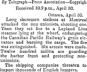 By Telegraph—Pres3 Association—Copyright Received 10.9 p.m., April 80. Ottawa, April 80. Long shoremen strikers at Montreal attacked the non unionists, shooting one. Then they set fire to a Ley-land Line steamer lying at the wharf, endangering the Canadian-Pacific Railway’s grain elevators and burning the cargo. The fire was extinguished. Six arrests were made. Twelve hundred militia are guarding the harbor front and protecting nonunionists. The shipping companies . threaten to import thousands of English lumpers.