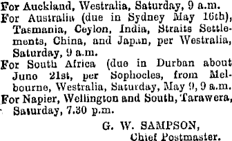 For Auckland, Westralia, Saturday, 9 a.rn. For Australia (due in Sydney May llith), Tasmania, Ceylon, India, Straits Settlements, China, and Japan, per Westralia, Saturday, 9 a.m. For South Africa (duo in Durban about Juno 21st, per Sophocles, from Melbourne, Westralia, Saturday, May 9, 9 a.m. For Napier, Wellington and South, Tarawera, Saturday, 7.30 p.m. G. W. SAMJPSON, Chief Postmaster.