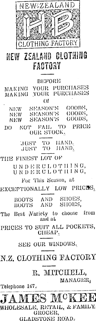 I MEWvZEALAND KSEffi BB 38 i i So* m) ssK CLOTHING.FACTORY NEW ZEALAND CLOTH! FACTORY BEFORE MAKING YOUR PURCHASES MAKING YOIJR PURCHASES Of NEW SEASON’S GOODS, NEW SEASON’S GOODS, NEW SEASON’S GOODS, DO NOT FA IE TO PRICE OUR STOCK. JUST TO HAND. .JUST TO HAND. TIIE FINEST LOT OF UNI) E R 0 L 0 T II I N G, U N I) E R C L O T II I N G, For This Season, at EXCEPTIONALLY LOW PRICBS. BOOTS AND SHOES, BOOTS AND SHOES, The Rest iVariety to clioose from anil at PRICES TO SUIT ALL POCKETS, CHEAP, SEE OUR WINDOWS. N.Z. CLOTHING FACTORY R. MITCHELL, MANAGER^ Telephone IG7. JAMES M°KEE WHOLESALE, RETAIL, & FAMILY GROCER, GLADSTONE ROAD,