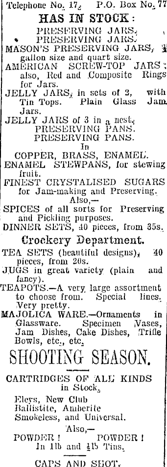 Telephone No. 17, P.O. Box No. 77 has liar stock : PRESERVING JARS. * PRESERVING JARS. MASON’S PRESERVING JARS, £ gallon size and quart size. AMERICAN SCREW-TOP JARS; also, Red and Composite Rings for Jars. JELLY JARS,; in sets of 3, with Tin Tops. Plain Glass Jam. Jars. JELLY JARS of 3 in a ncsi. : PRESERVING PANS. PRESERVING PANS. In COPPER, BRASS, ENAMEL'. ENAMEL STEWPANS, for stewing fruit. FINEST CRYSTALISED SUGARS for Jam-making and Preserving. Also,— SPICES of all sorts for Preserving aiid Pickling purposes. DINNER SETS, 10 pieces, from 355, Crockery Department. TEA SETS (beautiful designs),; 40 pieces, from 20s. JUGS in great variety (plain and fancy). TEAPOTS.—A very large assortment to choose from. Special lines. Very pretty. MAJOLICA WARE.—Ornaments in Glassware. Specimen Vases, Jam Dishes, Cake Dishes, Trifle Bowls, etc., etc. SEASON. CARTRIDGES OF ALL KINDS in Stocky Elcys, New Club Ballistite, Amberile Smokeless, and Universal. Also,— POWDER 1 POWDER ! In lib and lib Tins, CAPS AND SHOT.
