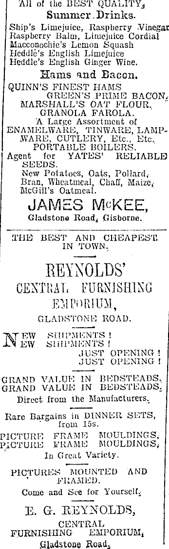 All of the BEST QUALITY* Summer Drinks. Ship’s Limejuice, Raspberry .Vinegar Raspberry Balm, Limejuice Cordial Macconochie’s Lemon Squash Heddle’s English Limejuice Heddle’s English Ginger Wine. Hams and Bacon. QUINN’S FINEST HAMS GREEN’S PRIME BACON. MARSHALL’S OAT FLOUR. GRANOLA FAROLA. A Large Assortment of ENAMELWARE, TINWARE, LAMPWARE, CUTLERY, Etc., Etc. PORTABLE BOILERS. Agent for YATES’ RELIABLE SEEDS. New Potatoes, Oats, Pollard, Bran, Wheatmcal, Chaff, Maize,; McGill’s Oatmeal. JAMES McKEE, Gladstone Road, Gisborne. THE BEST AND CHEAPEST, IN TOWN, REYNOLDS’ CENTRAL FURNISHING EMPORIUM, GLADSTONE ROAD. MEW SHIPMENTS ! EW SHIPMENTS ! JUST OPENING ! JUST OPENING ! GRAND VALUE IN BEDSTEADS, GRAND VALUE IN BEDSTEADS. Direct from the Manufacturers, Rare Bargains in DINNER SETS, from las. PICTURE FRAME MOULDINGS, PICTURE FRAME MOULDINGS,In Great Variety. PICTURES MOUNTED AND FRAMED. Come and See for Yourself. I E. G-. REYNOLDS, CENTRAL FURNISHING EMPORIUM, Gladstone Road.,