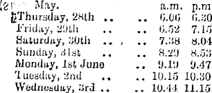 [SI May. a.m. p.m. 2Hth ~ .. (J.OIJ 11. JO Friday, 2hth .. .. (1.72 7.17 Saturday, -iOtli 7.lid 8.01 Sunday, A Ist .. .. 8.21) H. 71; Monday, Ist Juno .. 9.1!) 0.47 Tuesday, 2nd .. ..10.15 10.30 Wednesday, 3rd .. .. 10.41 11.15