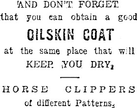 'AND DON’T FORGET, that you ean obtain a good GILSKiN COAT at the same place than w II KEEP. YOU DRY a HORSE CLIPPERS ol (liderent Patterns;;