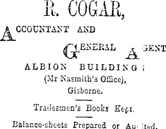 R, COGAB, CCOUNTANT AND QE.NEEAL A ALBION BUILDING (Mr Nasmith’s Office), Gisborne. IE NT Tradesmen’s Books Kept. Balance-sheets Prepared or Au ted.