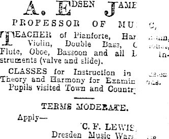 A. E DSEN J AM£ I'KOFESSOB OF M U rpEACHEIt of Fianforte, Bar -2_ \iulin, Double Bass, ( Flute, Oboe, Bassoon and all L struraents (valve and elide}. CLASSES for Instruction in Theory and Harmony for Esarnin Pupils visited Town and Countr. TEEMS MODEEATE. Apply— C. F. LEWIS Dresden Music Wars.