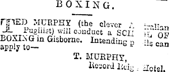 BOXING, FinED MURPHY (the clever -2- Pugiiist) will conduct aSC 11 BOXIXG in Gisborne. Intendin'- n apply to— ~ T. MURPHY, Record lido iG OF Ms can Motel.