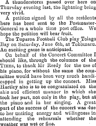 A thunderstorm passed over here on Thursday evening last, the lightning being very vivid. A petition signed by all the residents here has beer! sent to tho PostmasterGeneral re a whole time post office. Wo hope tho petition will bear fruit. The Tuparoa Football Club play Tolago Bay on Saturday, Juue 6th, at Tokomaru. An exciting game is anticipated. On behalf of the Concert Committee I should like, through the columns of the Times, to thank Mr Reedy for the use of his piano, for without the same the committee would have been very much handicapped in getting up the concert. Miss Hartley also is to be congratulated on tho able and efficient manner in which she took her part, not only in tho play, but at the piauo and in her singing. A great part of tho success of tho concert was due to her untiring energy and willingness in attending the rehearsals whether the weather was wet or line.