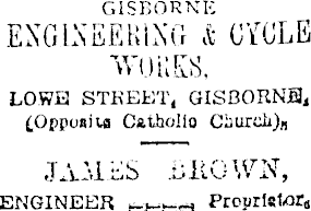 GISBORNE ENGINEERING & CYCLE WORKS, LOWE STREET, GISBORNB, (Oppoiiiu Catholio Chun^i)n JAIL Lb siiGWN, ENGINEER Prcurlsl-oEo