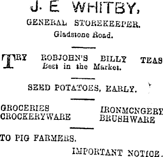 J- £ WHITBY, GENERAL STOREKEEPER. Gladstone Road. T B2 EOBJOHN’3 BILLY Best in the Market. TEAS SEED POTATOES, EARLY. V GROCERIES CROCKERYWARE IRONMONGERY brushware TO PIG FARMERS. IMPORTANT NOTICE,