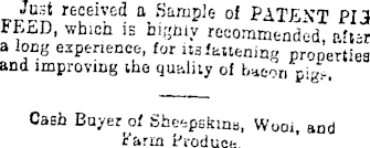 Just received a_ Sample of PATENT PIT rEioD, whicn ie highly recommended a long experience, for its fattening properties and improving the quality of bacon pig,. Cash Bayer of Sheepskins, Worn, and Farm Produce