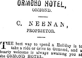 OSMOND HOTEL OEMOHD. 0. I\ E fcj NAJN . PBOPEIETOB. rn H E best way to spend a Holiday is to take a ride or arive to Ormond, and a bearwy welcome is alwavs awaiting *» nn 0 * theOEMOND HOTEL. g jou at