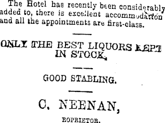 The Hotel haa recently been considerably added to, there is excellent aecomnmdatfon and all the appointments are first-class. O&LX THE BEST LIQUORS XSPT IN STOCK, GOOD STABLING. C, NEENAN, eopbietor.