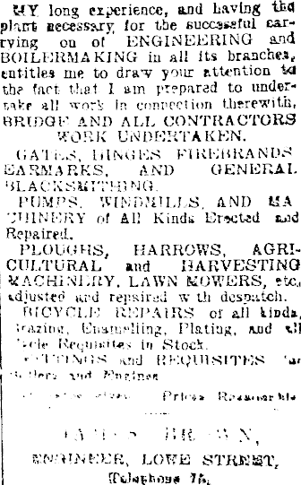 MY long experience, ami having tfcfl plant eecessjjry; for the successful carrying on ot ENGINEERING and BOILERMAKING in all its branches, entitles me to draw your attention ta th? fact that I am prepared t.o undertake all 'vori in connect ion therewith, BRIDGE AND ALL CONTRACTORS '•FORK UNDEKTAKEN. GATES, IiINGES FIREBRANDS EARMARKS, AND GENERAL BLACKSUITHINO. POMPS. '.V(ND,HILLS. AND 15A CMINEKY of All Kinds Erected «usd Repaired. PLOUGHS, HARROWS, AGRICULTURAL and HARVESTING MACHINERY, LAWN MOWERS, etc., vdiusted ttrd repaired w tit despatch, mCYCI.E REPAIRS ol all kind*. ! r azim!, Enamelling, Plating, and si! '.tie R(-(jim;ii«, in Stock, r -'ITIViS and REQUISITES 'a> vf* ?*':t rip.s'fs Prt< »>* r HU i H , " X, RNHWKEK, LOTfE STRESS!’, (Ttitafkwts# 7A,