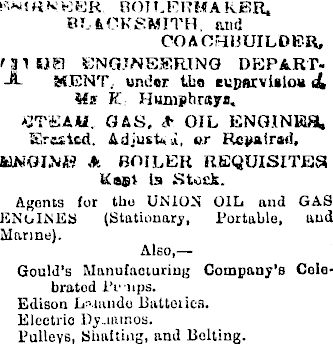 K.NJ«*E«R ROJLERMA KBR, BLACKSMITH am! CO A Or-IBUILDER, >3 1 SJH ENGINEERING DEPART--tt- WENT., under tba euparvlslo# t& Afa K Humphreys. CTEAJU. GAS, > OIL ENGINES, Eras ted. Adjust*,;, or Repaired, 4INGINK A BOILER REQUISITES Ka®t Is Stuck. Agents for the UNION OIL and GAS ENGINES (Stationary, Portable, and Marine). Also, — Gould's Manufacturing Company’s Celebrated l’i'iips. Edison Battoiies. Electric Dynamos. Pulleys, Shafting, and Bolting.