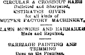 CIRCULAR & CROSSCUT HAUSSt OkUlciUtKi fctd ShjirpsnMl, ESTIMATES GIVEN for ill kinds of RUTTER FACTORY MACHINERY, L AWti MOWERS AND EARMARKS ft?.ade ecd RipalieiL saebmge painting &hb TRIMMING &aw oa th® Premises*